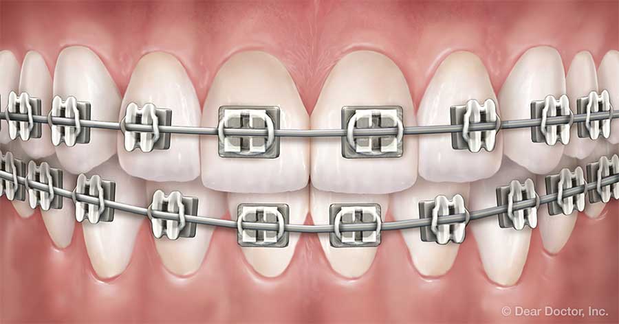 Traditional Metal Braces — This is probably what you think of when you picture someone wearing braces: small metal brackets bonded to the front of the teeth. A thin wire runs through the brackets and is attached on either end to metal bands that go around a back molar.
